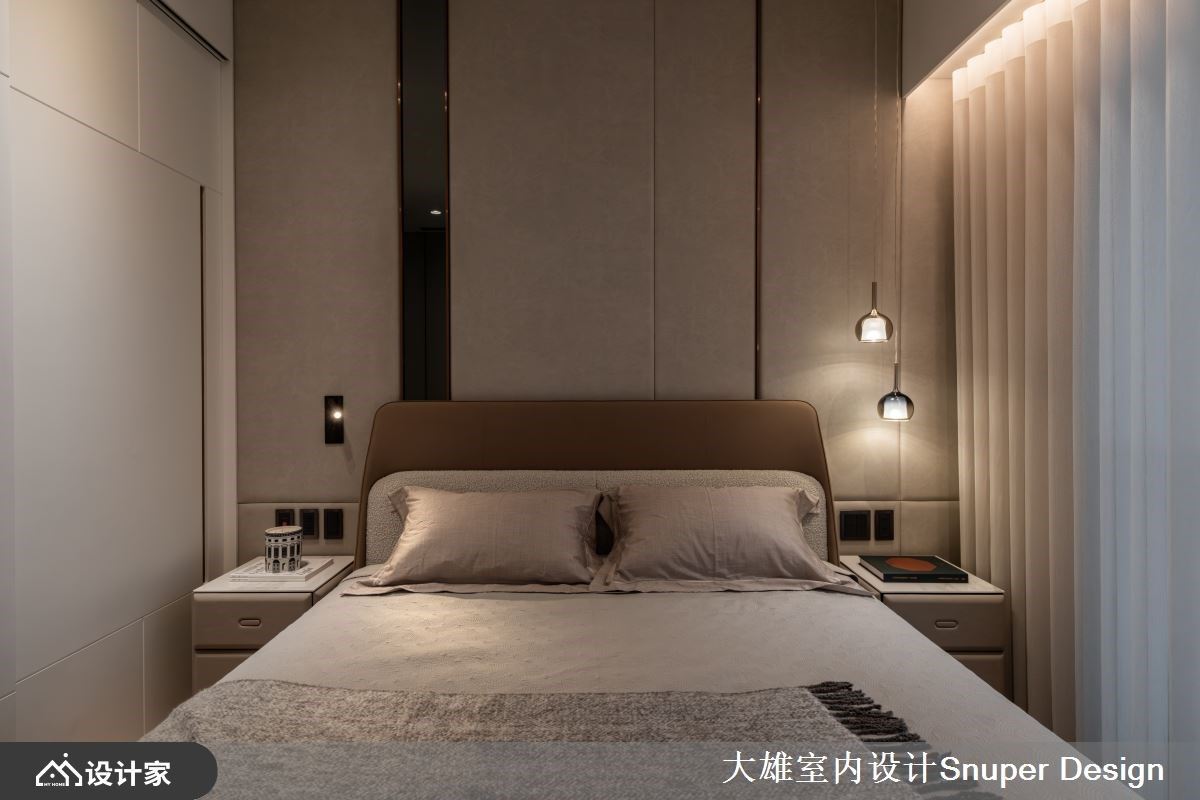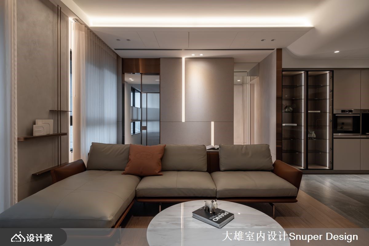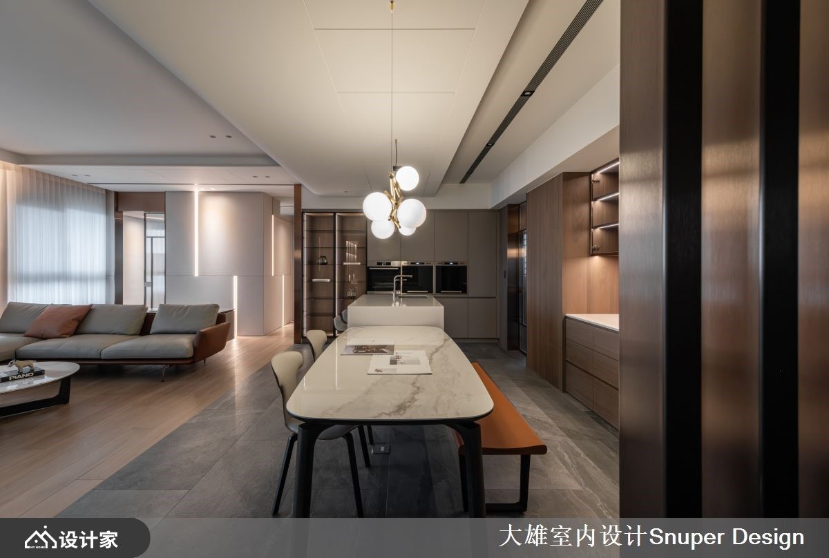 顶层117平米的现代风住所,不仅是一处居所,更像是一首描绘生活节奏的诗篇,透过温暖自然的设计语汇,传递出细腻的情感与和谐的氛围,让一家四口共筑出一个温馨而优雅的家。 设计之初,屋主与设计团队即以「实用与舒适」为核心思考。为了让生活动线更加开阔,原有的一间浴室与卧室被取消,转而扩大客厅与开放式厨房,使公领域展现通透与明亮的质感。主卧与孩子的房间则分列在两侧,舍弃廊道的设置,让家人能直觉地走入各自的空间,回归单纯而便利的生活方式。 整体材质与色彩的选择围绕着宁静与稳定。公领域以部分的圆弧造型呼应屋主对流畅线条的偏爱;深棕色磁砖、海岛型木地板、灰纹砖相互交织,营造出层次感的地坪表情。电视墙以大理石的细致纹理展现质材特色,搭配顶级音响,成为全家共享的视听中心。书房则透过实木贴皮、镀钛圆管与石材台面组构,展现质感与机能的兼容。餐厅中岛与餐桌相邻,背后结合展示柜与备餐柜,不仅便利实用,更营造一家人共享天伦的温馨场景。