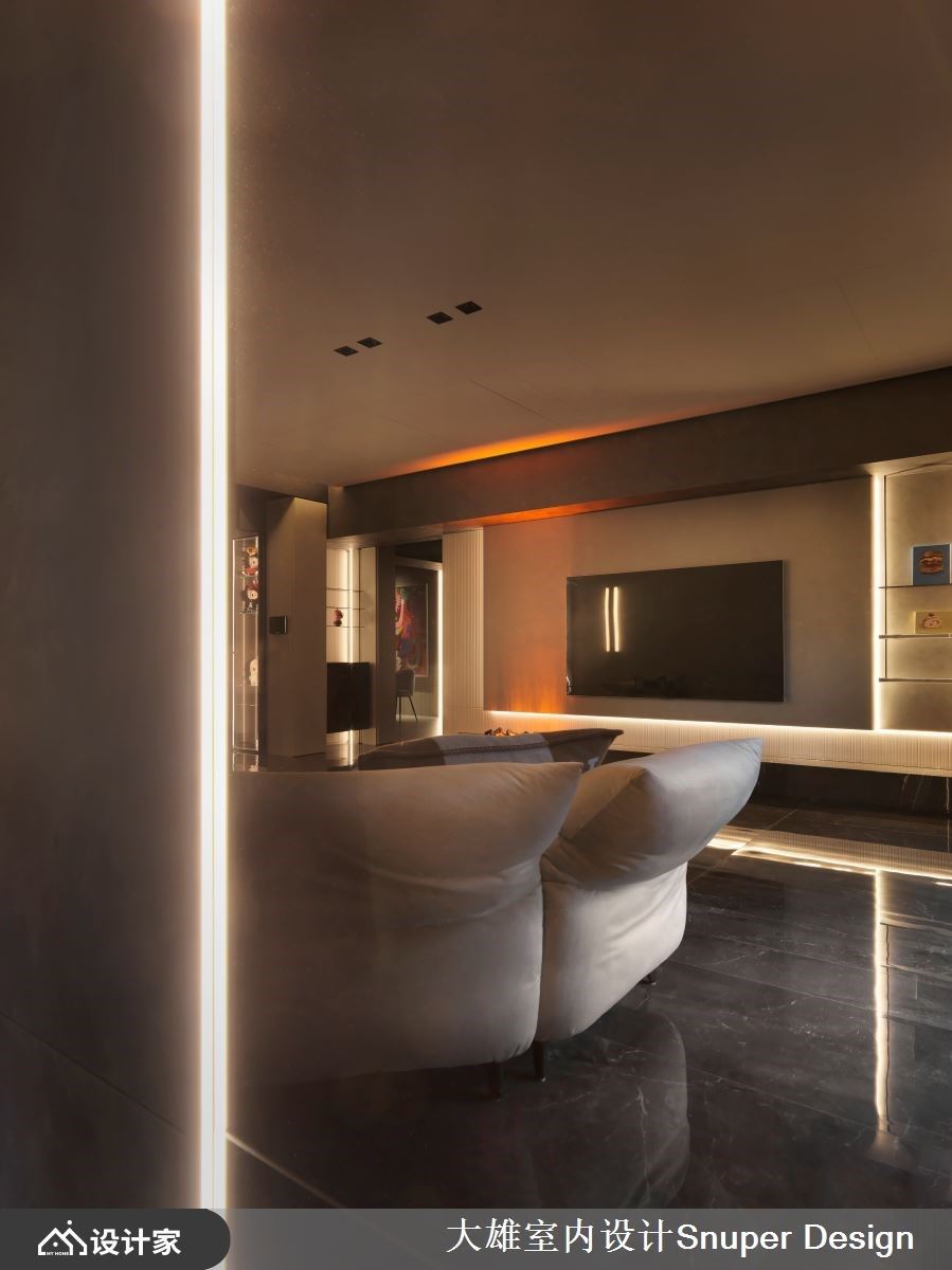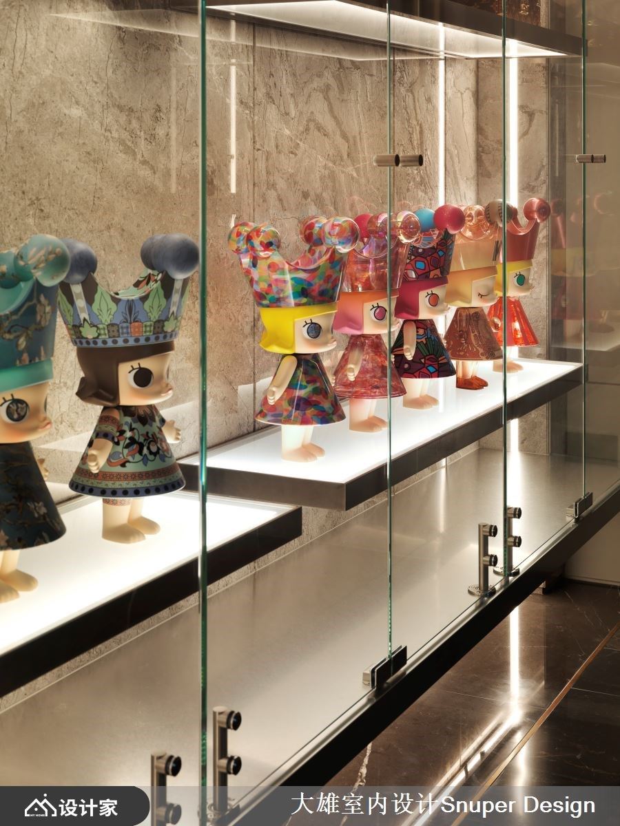 现代风188平米,位于台中精华地段的住宅,以利落格局与精准细节为设计重点,揭示年轻世代对生活的定义。屋主拥有大量泡泡玛特等潮流公仔收藏,设计团队不以传统展示柜应对,而是将「展示」化为空间核心。 除了收藏的场域之外,更是毛孩共生的日常舞台。在格局规划上,打破原有四房格局,重塑为一主卧与两间弹性次卧,并以双向更衣间为中轴,串联全室的生活流动。在拆除隔墙后,动线更为延展而开,让空间比例更显开阔,于简练之中释放呼吸感。 光线在此被赋予更变节奏的角色。日间,透过百叶调整日照角度,掌握光影变化;夜幕低垂,壁灯与情境照明承接氛围,形塑温润而安定的感受。整体采用雾面特殊涂料,取代金属反射,让光的笔触更显细腻。电视主墙特殊漆层层堆栈,呼应木化石平台的沉稳质地,壁炉与结合展示机能的猫跳台融合于立面,创造功能与美感并存的细节。全室展示柜以白膜玻璃与金属层板搭配内嵌光源,完整演绎 Kenny Wong《Molly》与 Fanny Brodar《Dirty Boots》系列的艺术姿态;展示柜背墙安格拉珍珠石材,随日夜变换折射光纹,展现动态的灵魂。