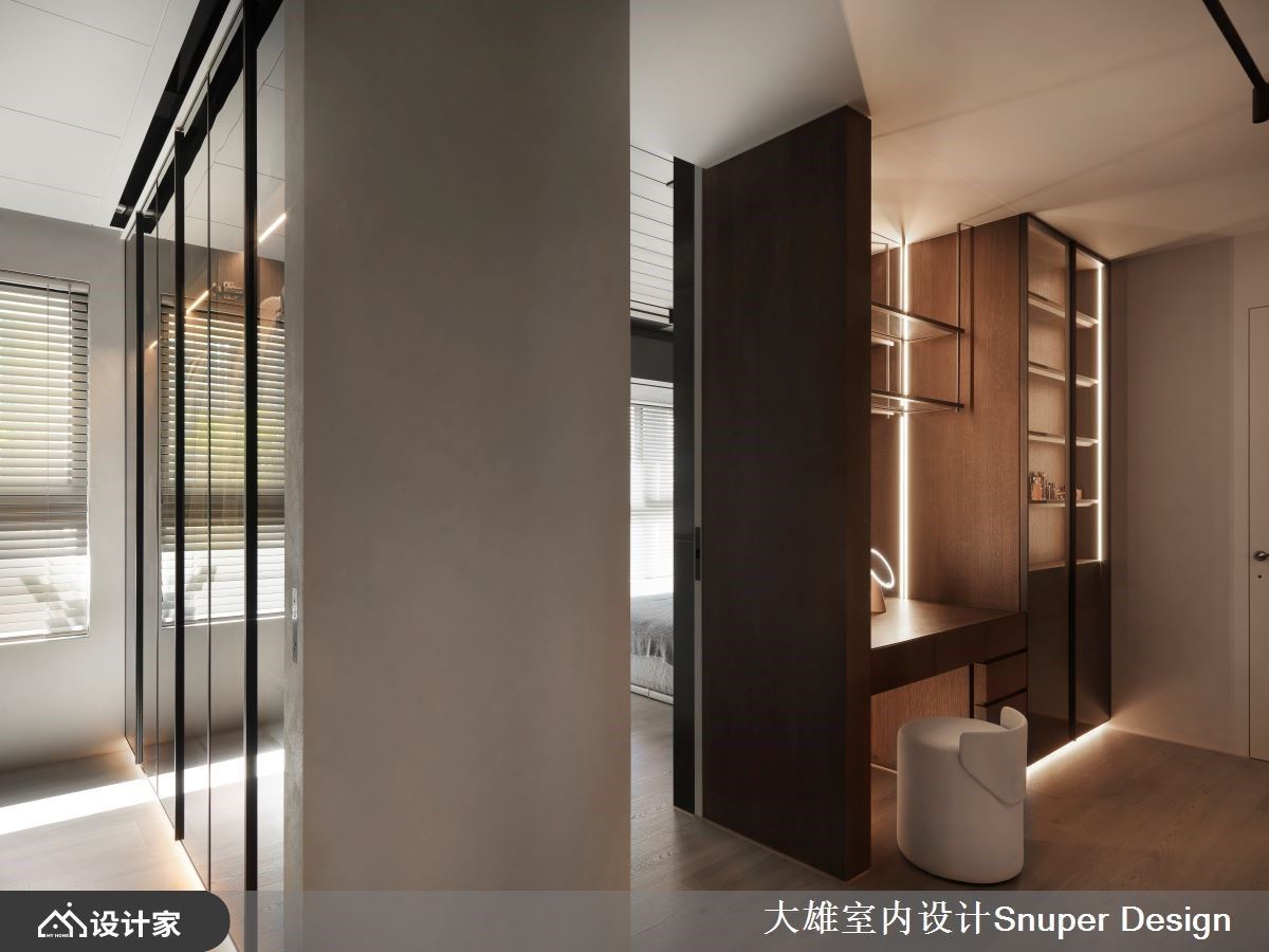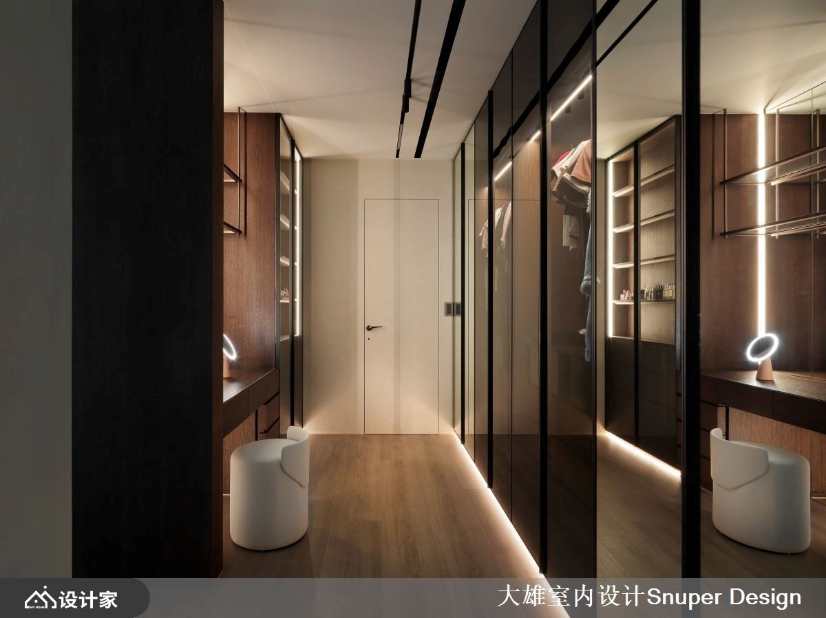 主卧室中整合投影幕、按摩椅等机能温柔地承接疲惫的身躯,书桌则随时待命,让工作与休憩无缝切换。步入双向更衣室,茶色玻璃门内的世界井然有序,中岛展示着精致小物,化妆台散发着专属的仪式感。整体空间以灰阶特殊漆沉稳的氛围与木质的温润相互交织,编织出一片静谧而温柔的空间。