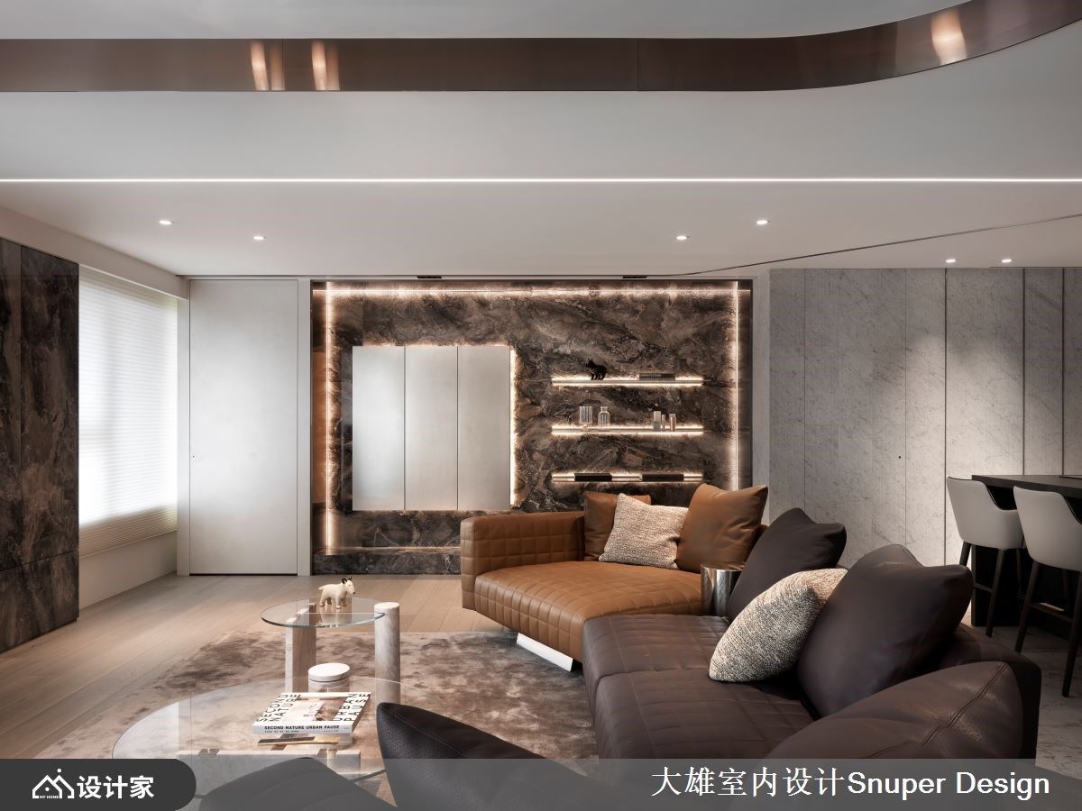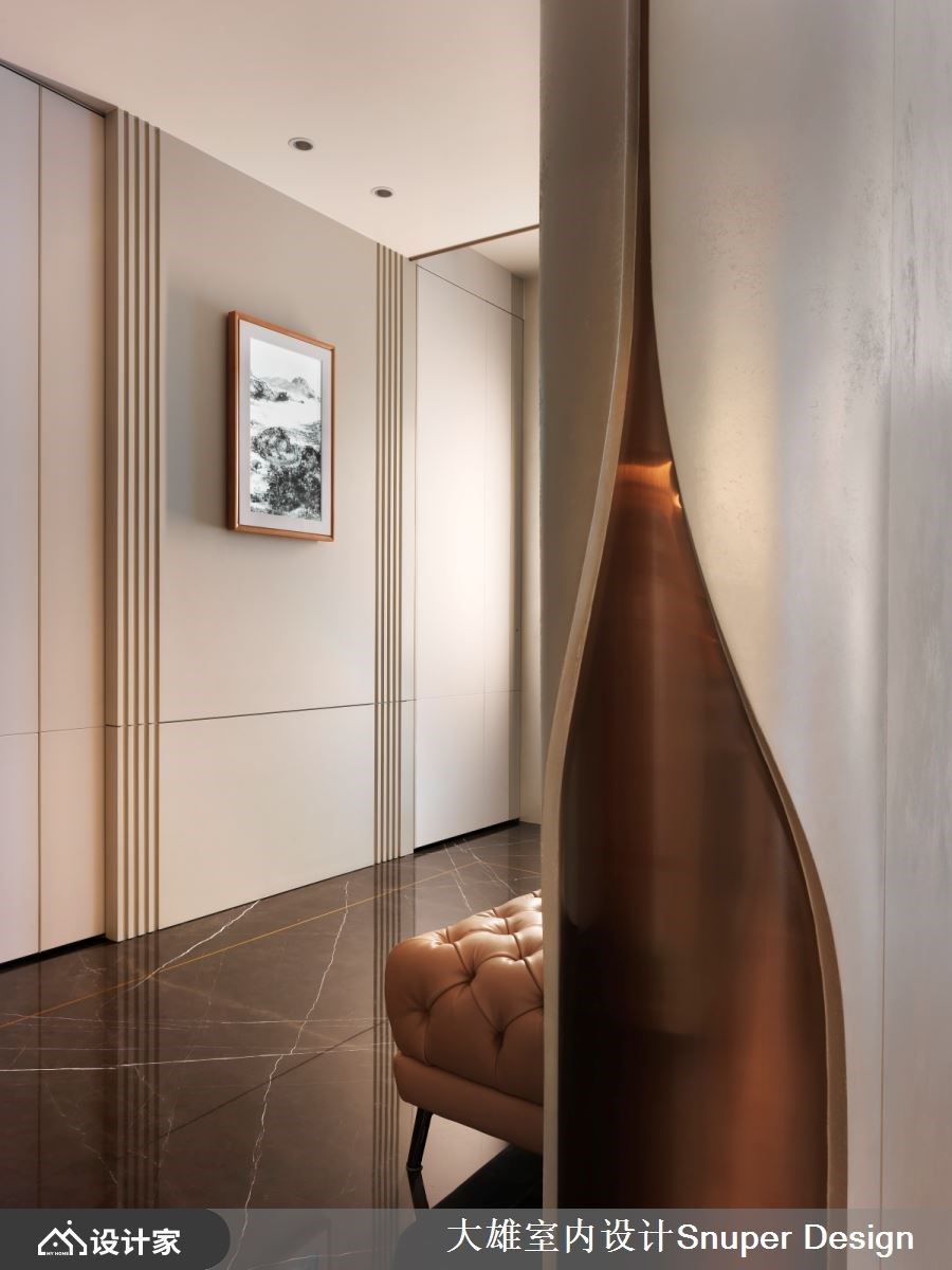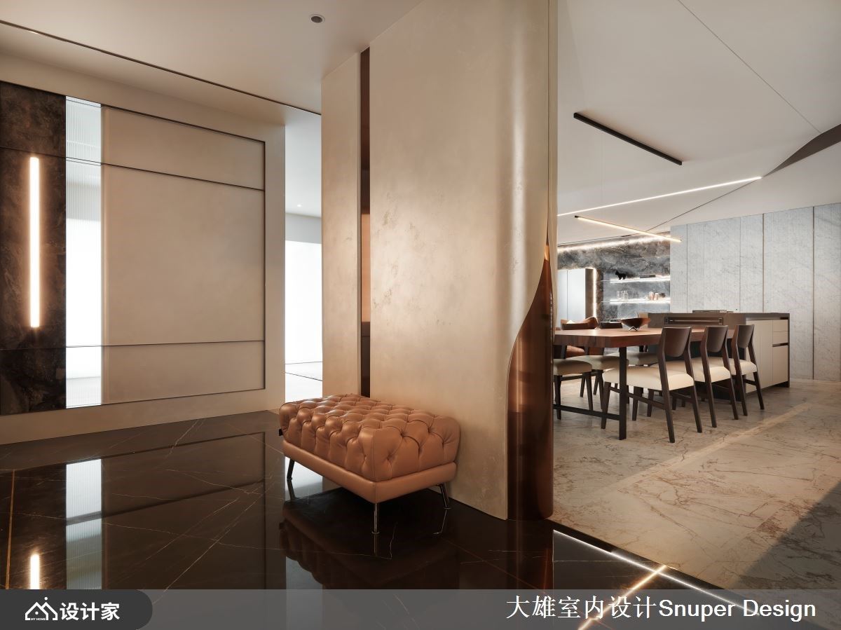 当事业版图跨越国界,世界各地的繁华在眼底逐一褪去,对于长年往返国际的企业家而言,所谓的奢华不再是材料的堆砌,而是一种能让心灵缓缓停靠的从容。这间位于市中心绿道旁的 172 平方米毛坯房,便是这份惬意的最终载体。 步入玄关,抹如女性高跟鞋后跟般的优雅曲线收边,为归家仪式注入了柔性力量,特殊漆与金属的交织,预告了空间的不凡质感。设计师大胆打破原始格局,将空间精炼为两室两厅,为夫妻与成年子女打造出前所未有的开阔尺度。最令人惊叹的莫过于吊顶的轴线转折,优雅曲线修饰了建筑梁柱,并以 45 度斜切延伸,使客餐厅形成如抛物线般的动态美。坐在厅区,都市轮廓与远山风景仿佛被延揽入室,空间层次随光影自然流动。 细品室内,每一处材质的运用都诉说著国际视野。客厅主墙选用意大利 Salvatori 卡拉拉白大理石,细腻的质地散发出内敛的精品气息;Minotti 咖啡色沙发则以稳重之姿,呼应屋主成熟且优雅的人生阅历。一旁的深色主墙巧妙隐藏了通往主卧的动线,悬浮柜结合奢石背板,展现出极致的都市精致感。餐厨区则由 Boffi 厨具主导,在工业感与优雅间取得平衡,让烹饪成为一种时尚享受。