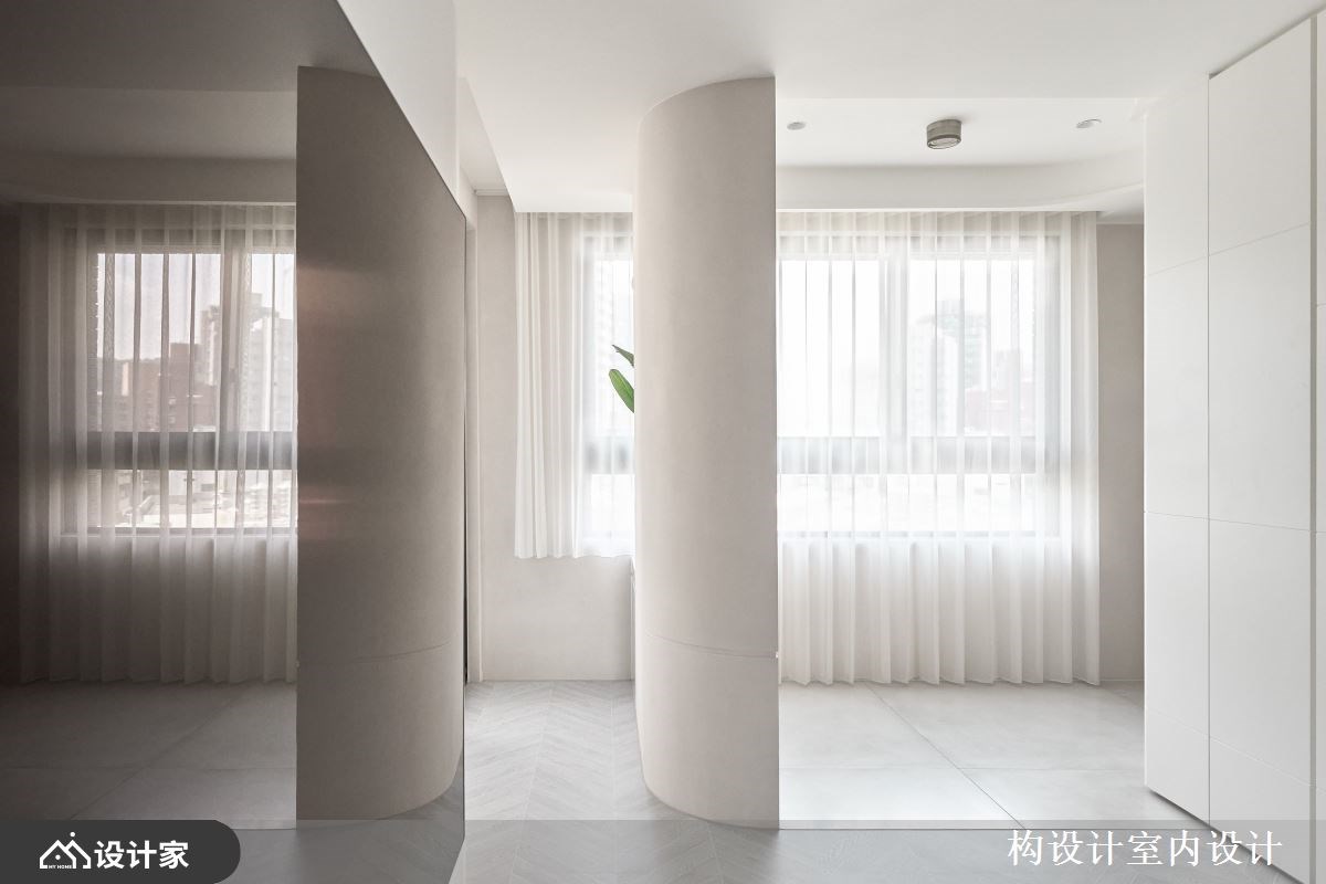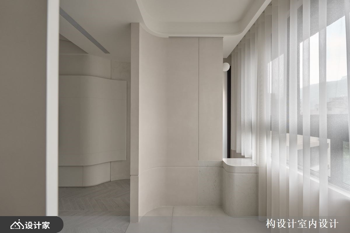 1. 玄关: 推开大门,玄关处以优美的弧形屏风作为空间序曲,不仅巧妙界定出落尘区与室内的疆界,更消弭了锐利棱角带来的压迫感,引导窗外采光在圆润表面轻盈流动,维持视觉的开阔与通透。落尘区选用进口磁砖无缝处理,一体成型的平面化效果不仅在视觉上放大空间,更兼具易维护清洁的机能优势,与室内温润的箭羽拼木地板形成鲜明对比,透过异材质的转换自然划分出内外之别。此外,弧形屏风底部巧妙拼接大理石材,利用异材质的视觉层次,建构出一处既美观又舒适的穿鞋空间。