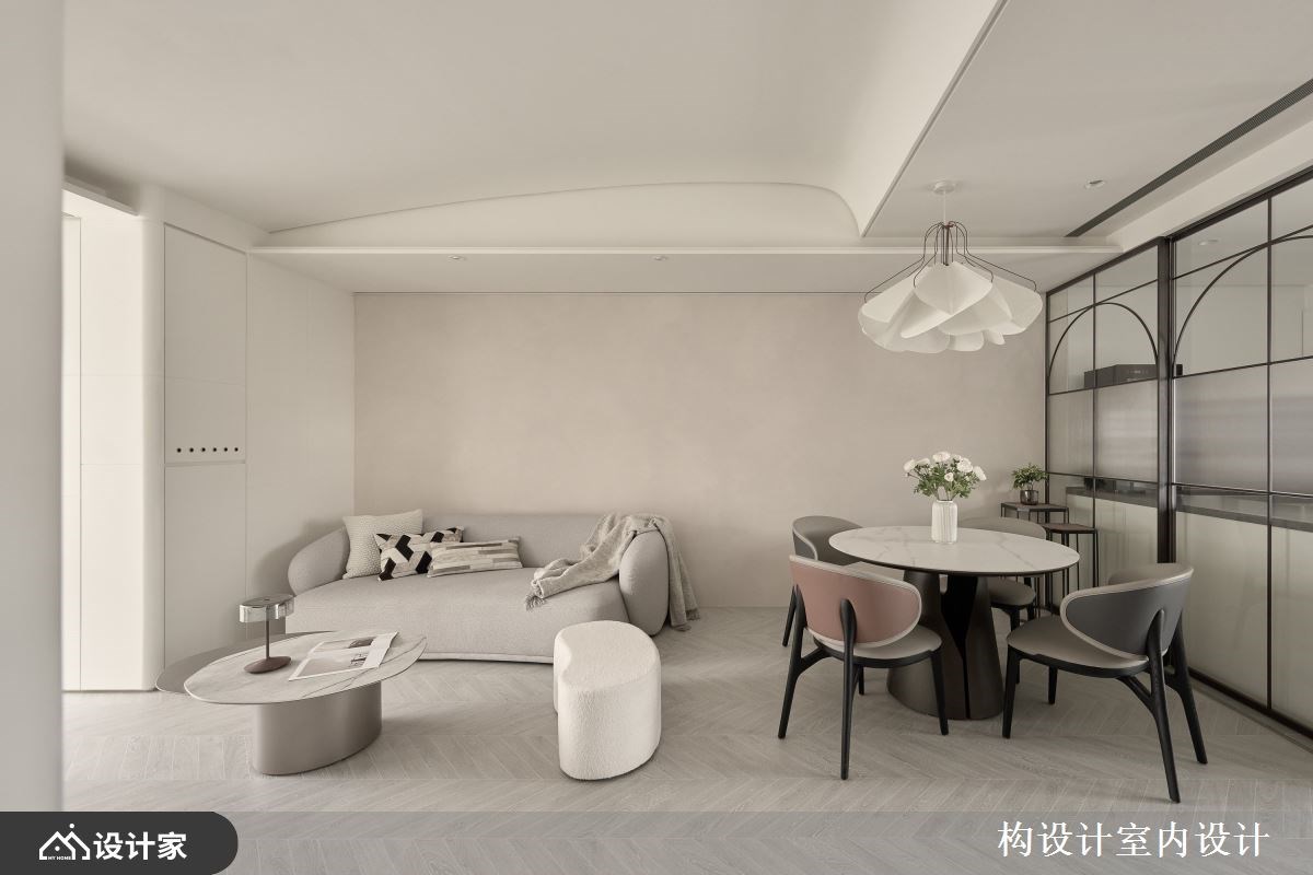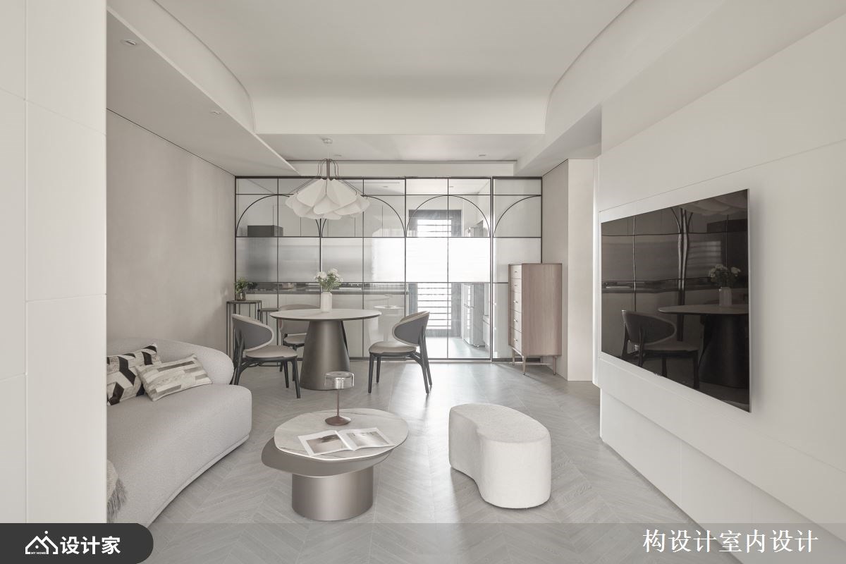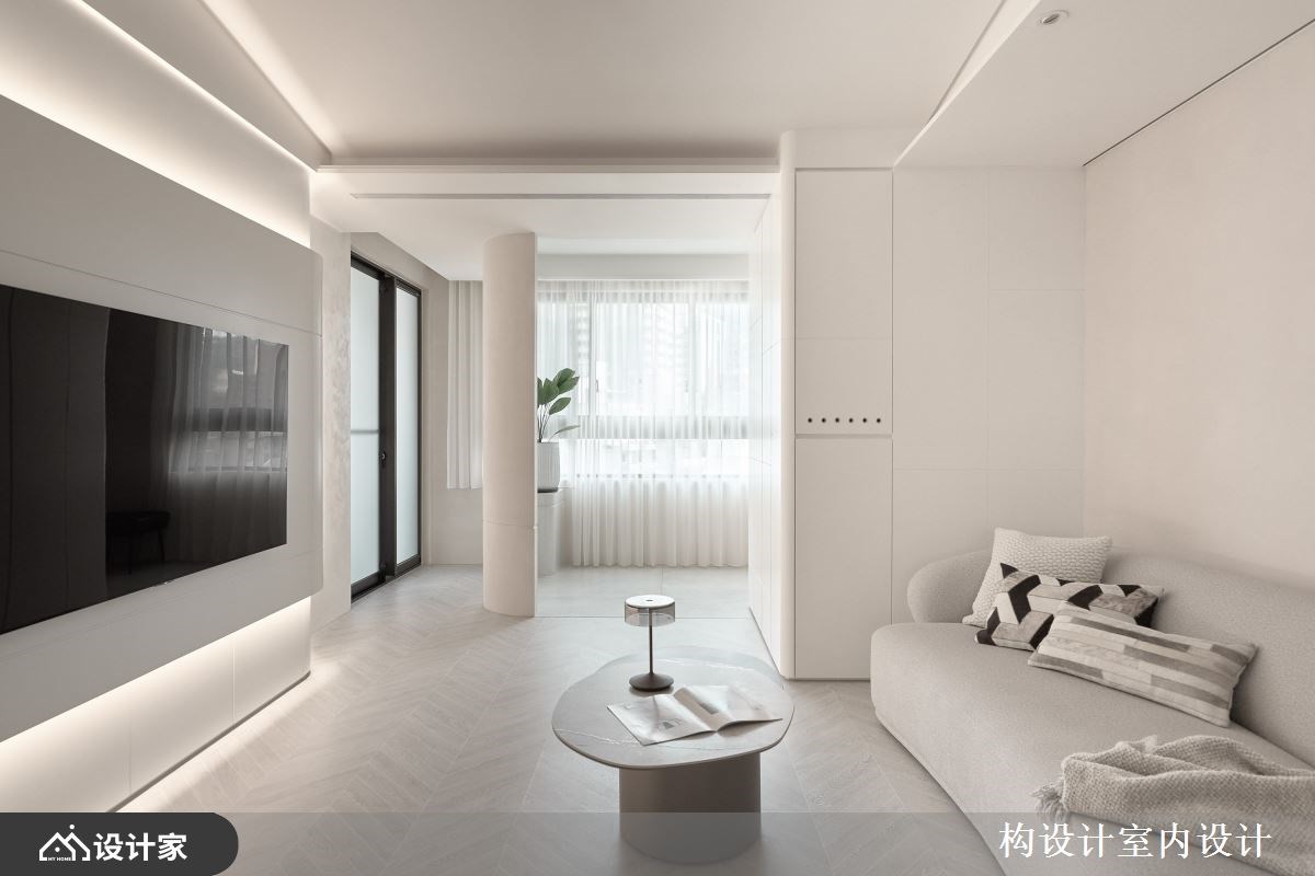 2.客厅空间: 在公共空间的格局规划上,设计师展现了精妙的空间剪裁,透过自定义的一道电视墙,在原本的两房格局中流畅地开辟出一间多功能房,成为孩子练琴与阅读的自由天地。为了细腻照护孩子的兴趣,书房选用镜面拉门设计,巧妙为女儿划分出专属的舞蹈练习区,同时也为男孩打造如音乐室般的沉浸式卧室,让家成为支持梦想的起点。视觉表现上,电视墙采取平面化设计以延展空间深度,搭配上下交织的灯带,让纯白立面在晕散光源下展现丰富层次。客厅天花板亦同步注入圆弧设计消弭锐利棱角,不仅引导光线在室内柔和流动,更与弧形沙发、茶几等软装相互呼应。这种一致的弧形语汇,打破了传统客厅的制式沉重感,在宁静而具层次感的光影变化中,建构出动线活络且充满温度的开放式生活场域。