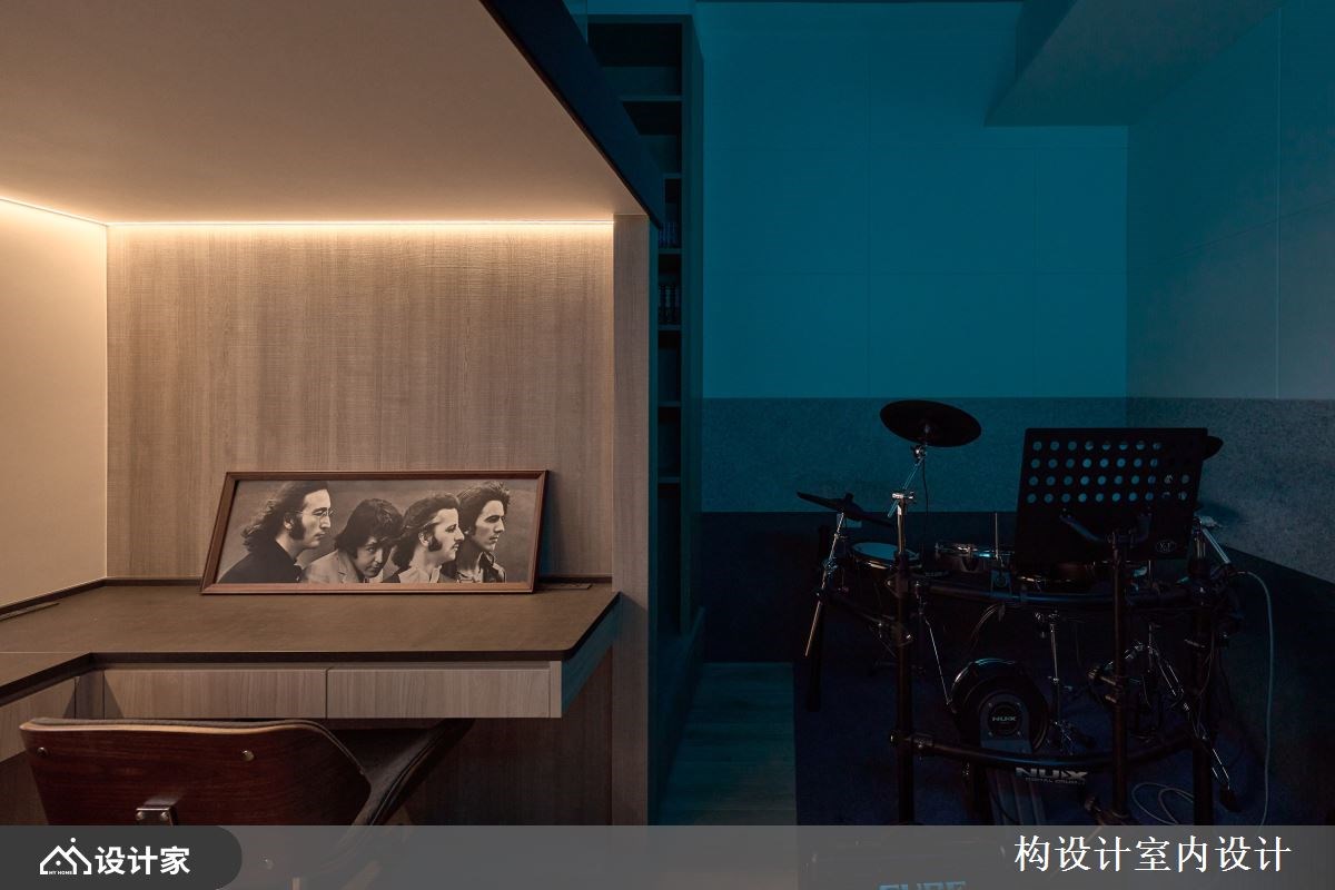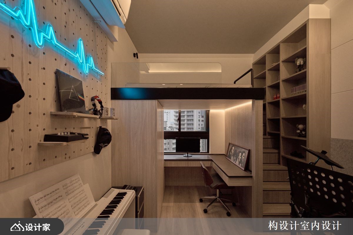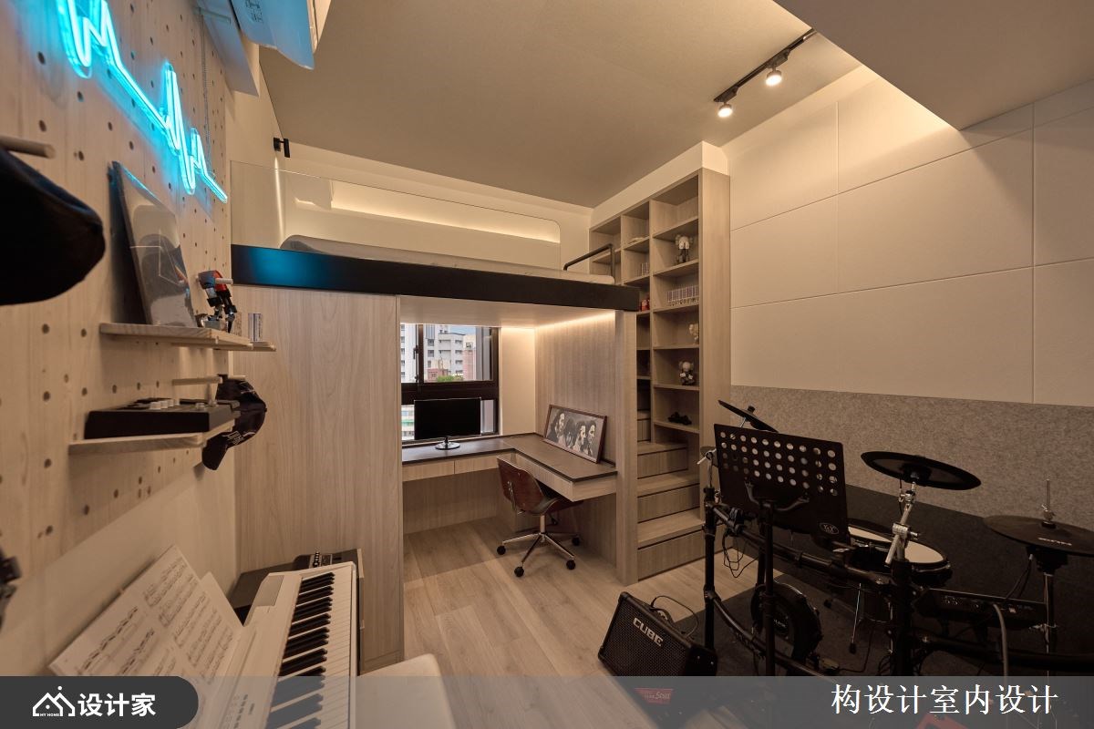4.男孩房: 在私人场域的规划中,设计师真正落实了将孩子兴趣融入生活的核心精神。男孩房巧妙利用架高地板作为机能分水岭,上方定义为纯粹的睡眠区;下方则利用结构产生的包覆感营造出静谧安稳的书房空间,让学习动线更加专注、不受干扰。房间其余大面积区域则变身为专业的练琴室,不仅能从容容纳电吉他、爵士鼓与电子琴,墙面更活用活动式洞洞板建构造型收纳,让耳机与珍藏的黑胶唱片成为最具个人风格的立面端景。
