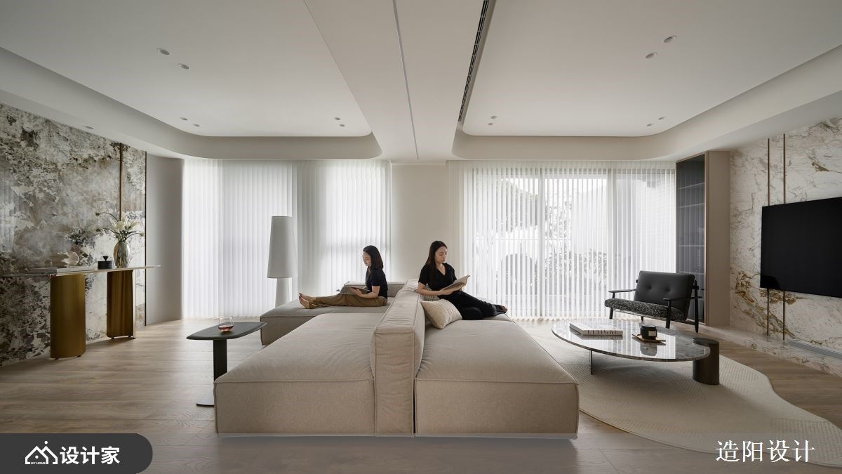 现代轻奢风住宅设计,双面沙发演绎开放客厅与起居空间让家人互动成亮点