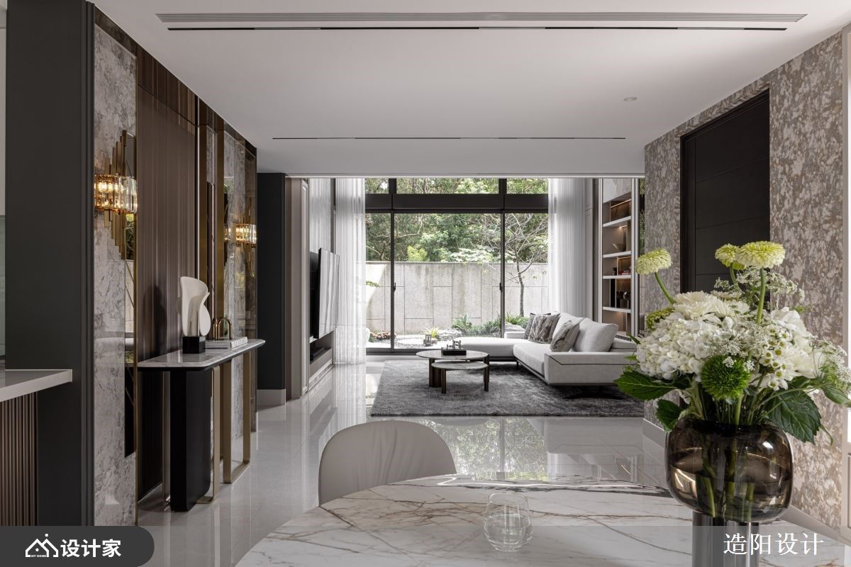现代轻奢风住宅设计,双面沙发演绎开放客厅与起居空间让家人互动成亮点